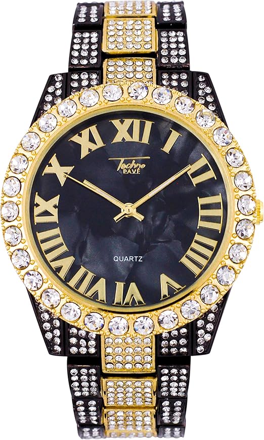 Amazon.com: Reloj para hombre con esfera romana helada de 1.772 in con esfera de mármol personalizada y bisel solitario – cristales de imitación – movimiento de cuarzo – oro de 14 quilates,