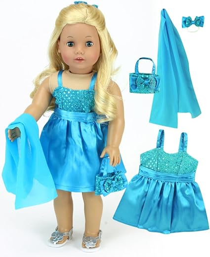 Amazon.com: 18 inch muñeca vestido 4 pc. Set, brillante turquesa ropa vestido de la muñeca, a juego bolso, chal y pelo lazo en satén y lentejuelas. Se adapta a American Girls Muñecas