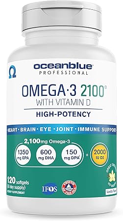 Amazon.com: Ocean Blue Omega 3 2100 w Vitamina D - 120 ct - 2100 mgs de DHA EPA DPA por porción - Soporte para ojos cerebrales - Sin postgusto pescado - 88%