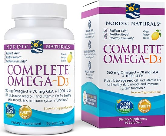 Amazon.com: Nordic Naturals Omega-D3 completo, sabor a limón, 565 mg Omega-3 + 70 mg GLA + 1000 UI de vitamina D3 - 60 geles blandos - EPA y DHA - Piel y